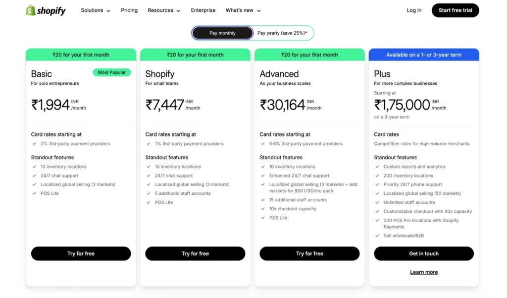Shopify offers a variety of pricing plans tailored to different business needs in India: